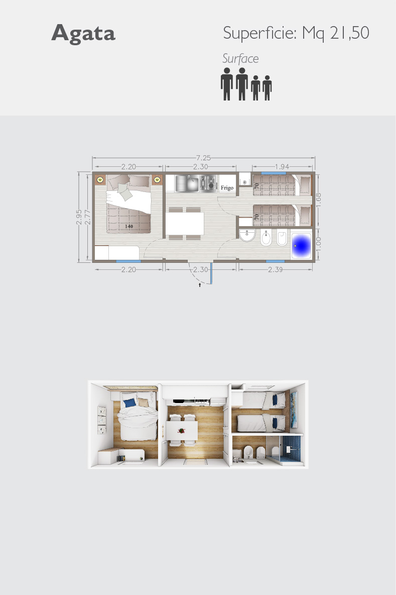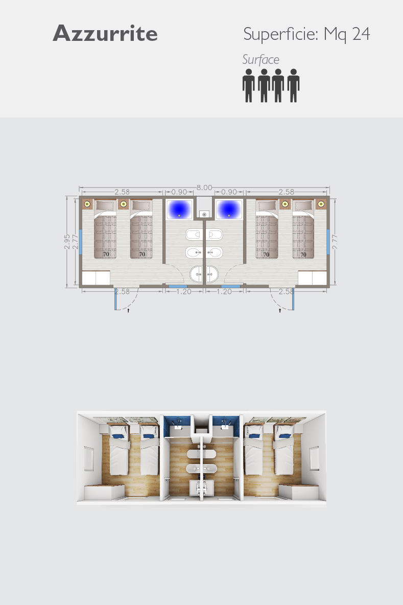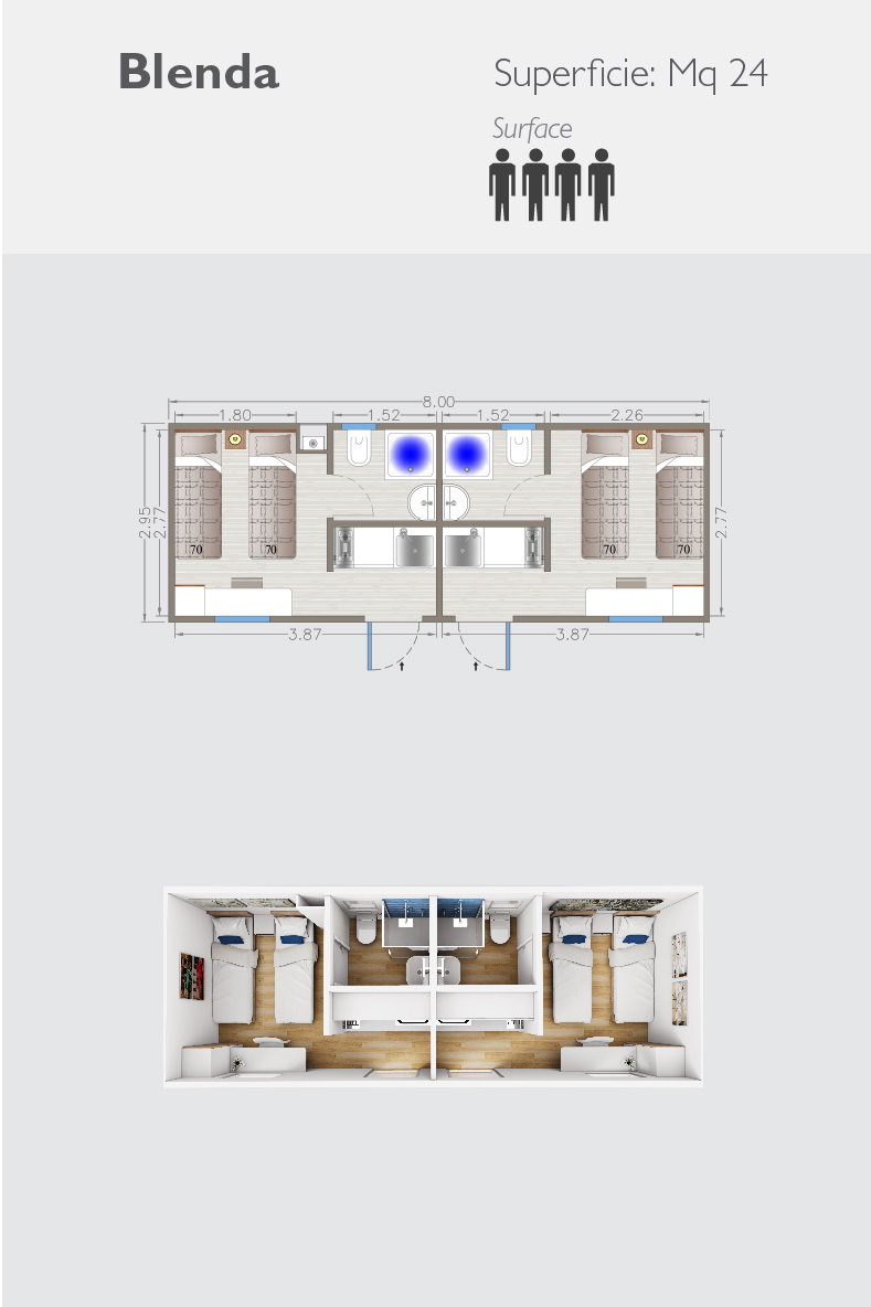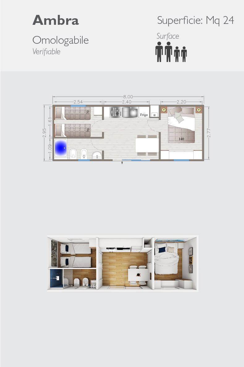 Each single prefabricated module measures from mt. 2.55 to mt. 4.10 maximum and develops a surface up to sqm. 34.00, approximately. with the possibility of assembling multiple and fully customized modules.