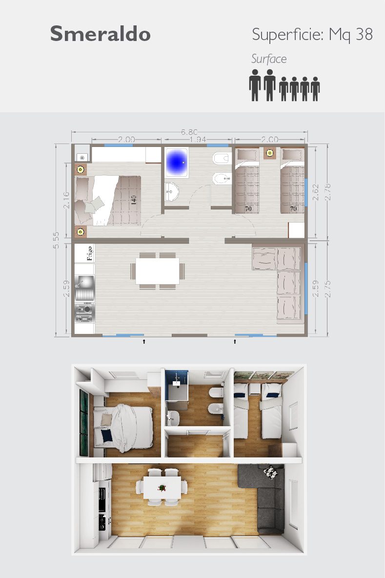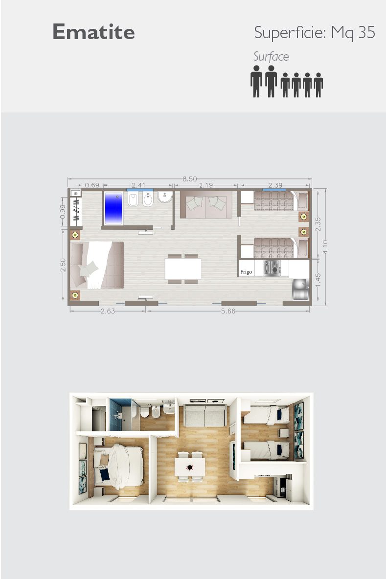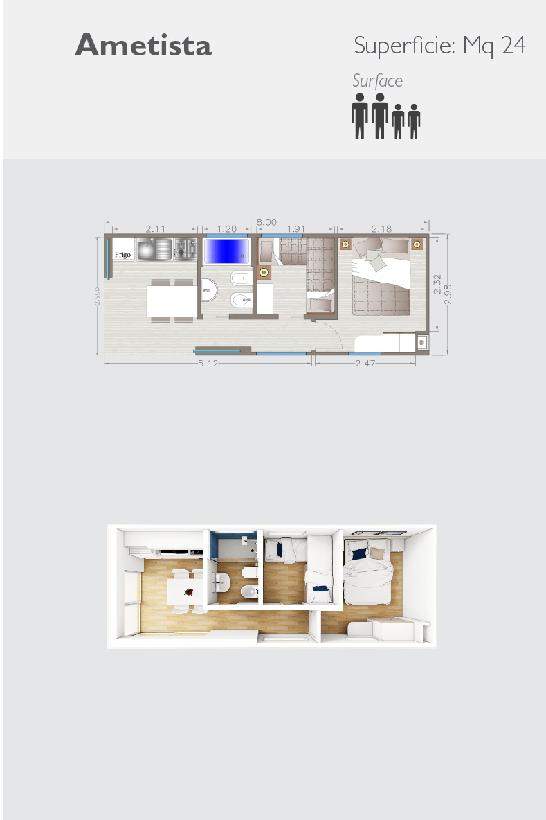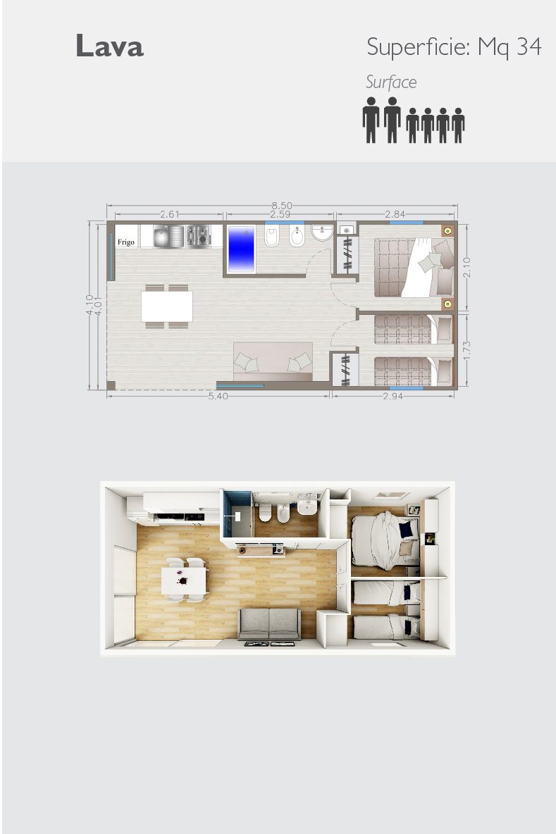 Each single prefabricated module measures from mt. 2.55 to mt. 4.10 maximum and develops a surface up to sqm. 34.00, approximately. with the possibility of assembling multiple and fully customized modules.
