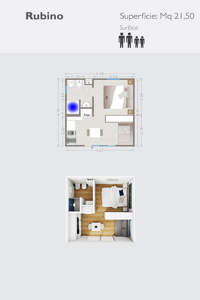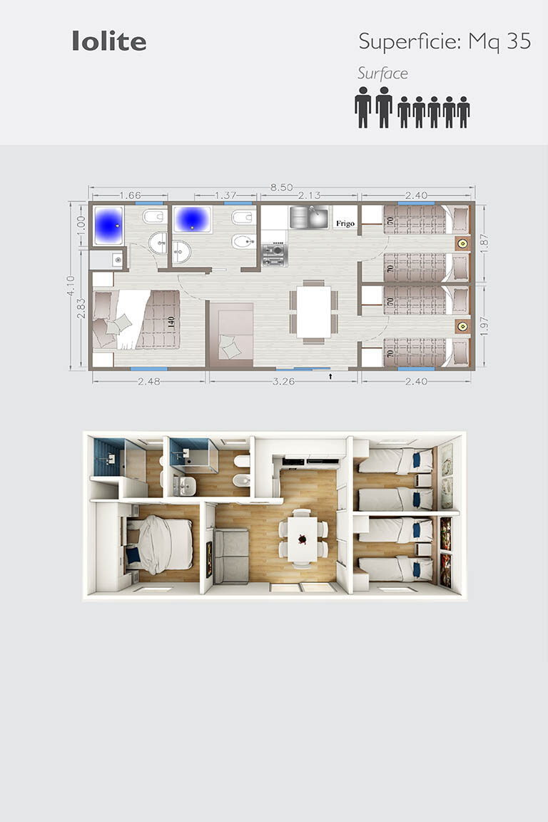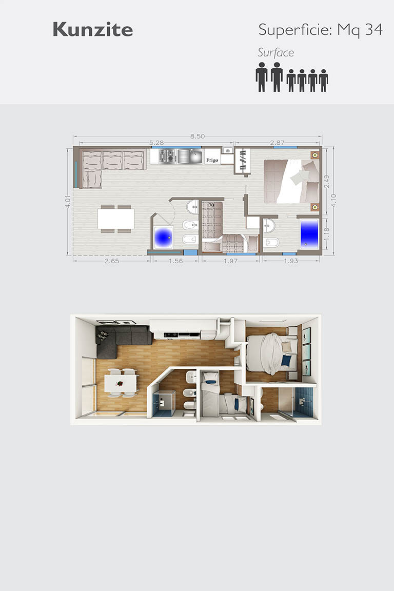 Ogni singolo modulo prefabbricato misura dai mt. 2,55 ai mt. 4,10 massimo, sviluppa una superficie fino a mq. 34,00 circa, con la possibilità di assemblare più moduli e di essere personalizzato a 360°.