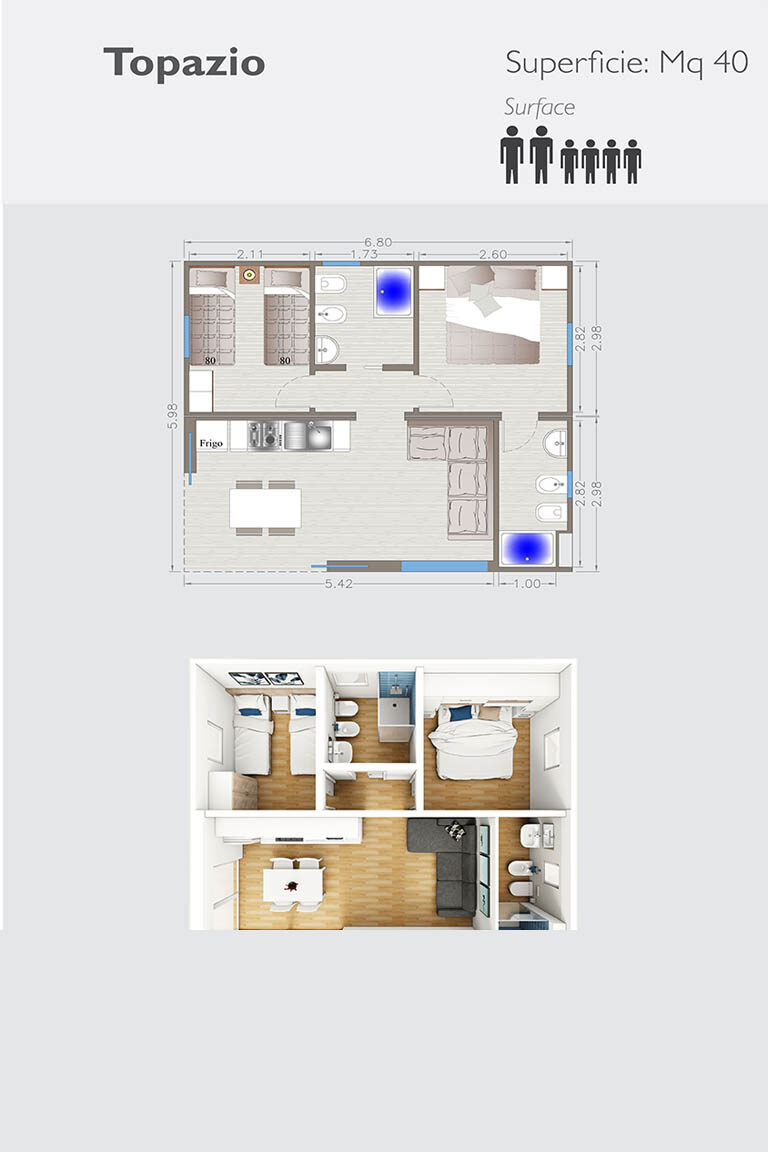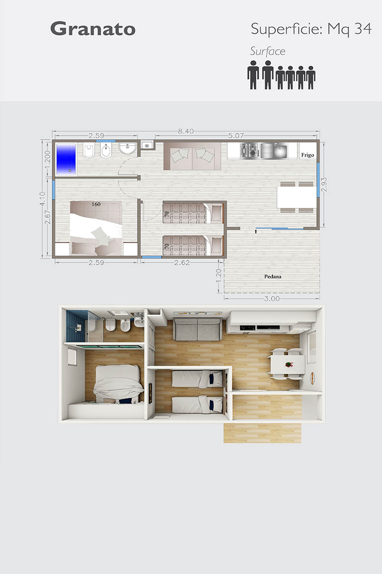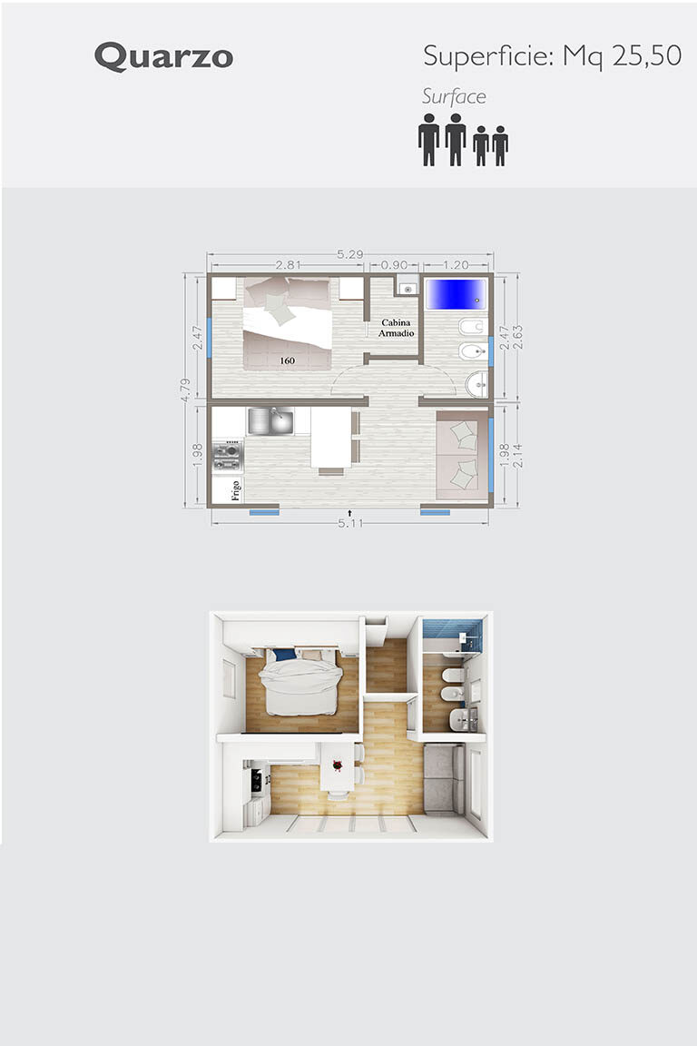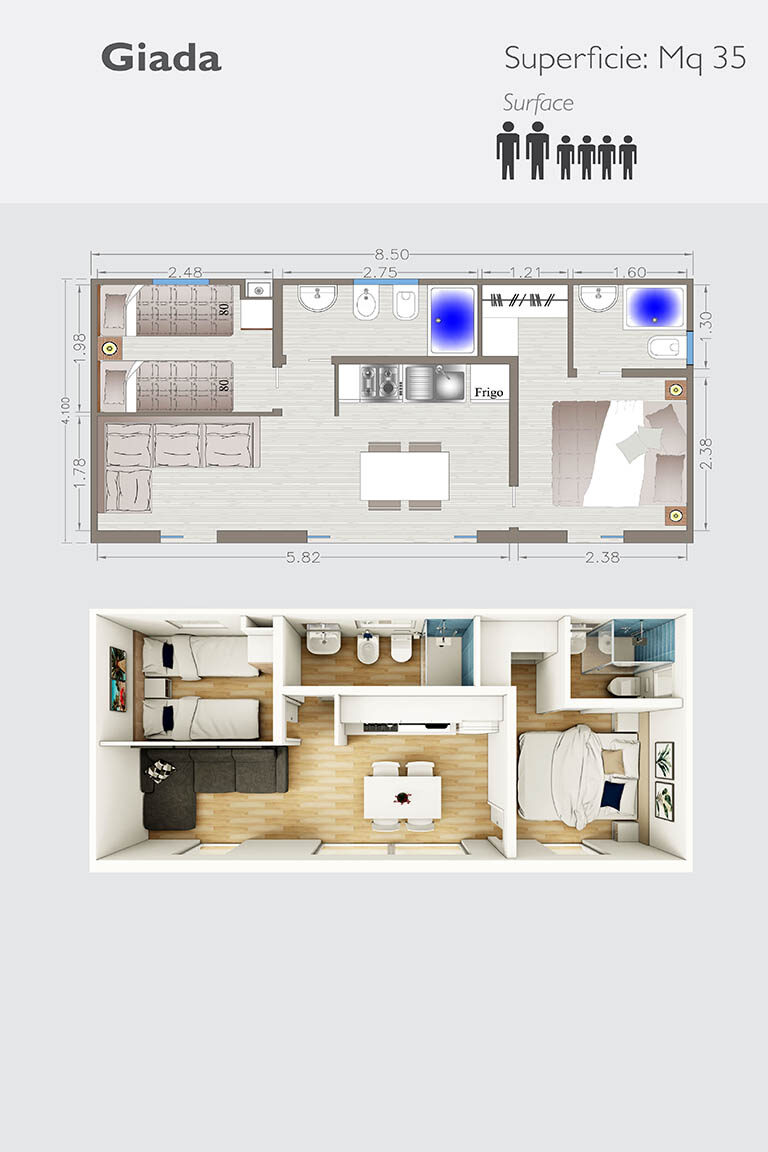 Ogni singolo modulo prefabbricato misura dai mt. 2,55 ai mt. 4,10 massimo, sviluppa una superficie fino a mq. 34,00 circa, con la possibilità di assemblare più moduli e di essere personalizzato a 360°.